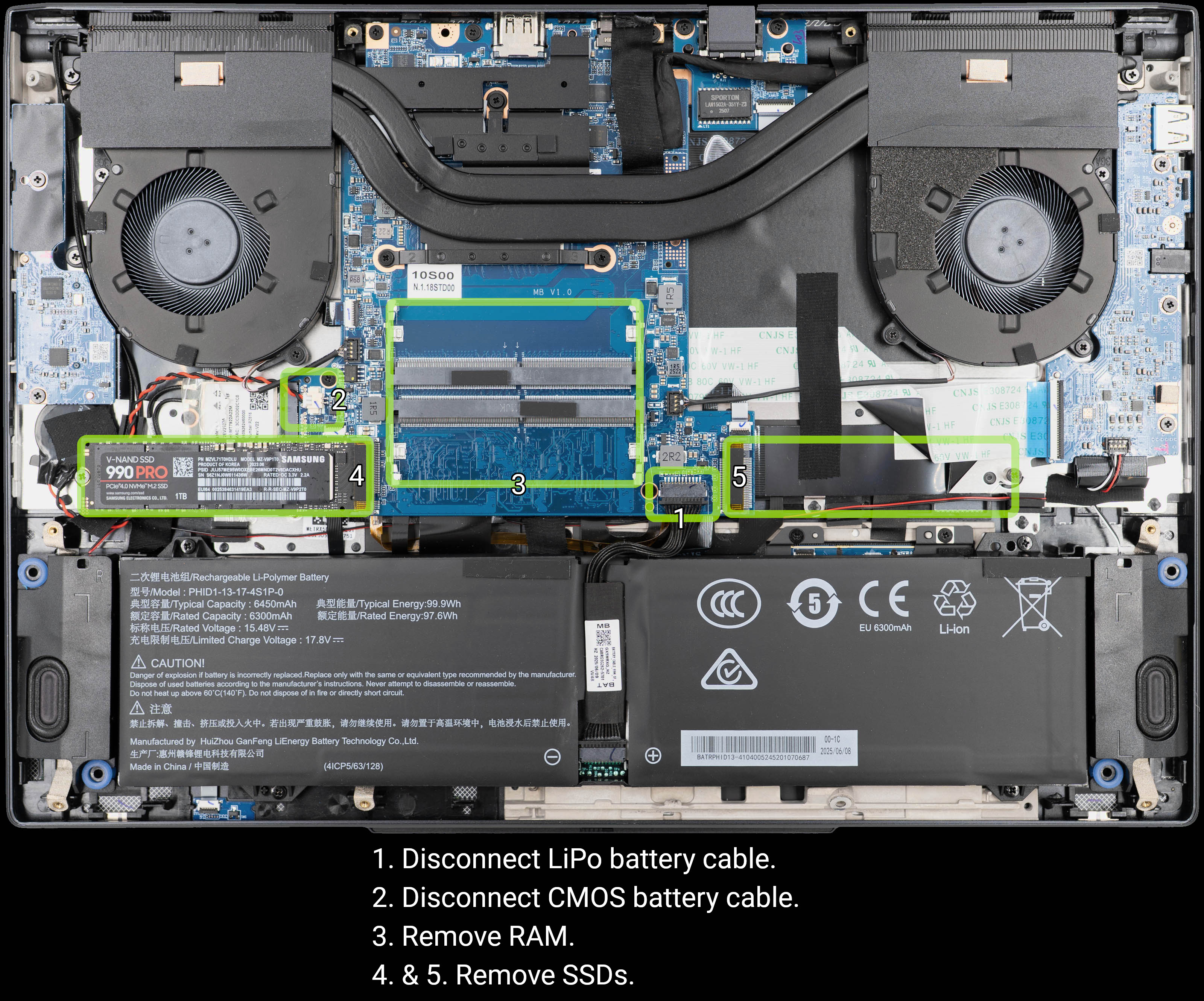 Gerät startet nach Deaktivierung der Management Engine nicht mehr EinführungDie Deaktivierung der Intel Management Engine (Intel ME) kann je nach System zu einem Zustand führen, in dem das System nicht mehr korrekt initialisiert werden kann und sich somit nicht mehr starten lässt. In diesem Zustand bleibt der Bildschirm schwarz - man kommt auch nicht mehr ins das BIOS-Setup, um die ME wieder zu aktivieren.Dieser Artikel beschreibt eine Hardware-Methode, wie sich dieser Umstand beheben lässt.Lösungsschritte Gerät ausschalten, etwa durch langes Drücken der Einschalttaste. Ladegerät/Netzteil vom Laptop trennen. Unterschale aufschrauben und entfernen (siehe Anleitung unten). Akku-Kabel vom Mainboard trennen. Kabel der CMOS-Batterie vom Mainboard trennen. Sämtliche RAM-Module entfernen. Sämtliche SSD-Module entfernen (Anzahl der SSDs hängt vom System ab). Einschalttaste für 30 Sekunden lang drücken. RAM-Module wieder einsetzen, aber SSDs noch nicht einsetzen. CMOS-Batterie und Akku-Kabel wieder mit Mainboard verbinden. Ladegerät/Netzteil anschließen. Gerät einschalten und einige Minuten warten, bis ein Startbildschirm erscheint. Im BIOS-Setup (F2) die Intel Management Engine wieder aktivieren und speichern (F10). Gerät startet neu. Gerät ausschalten, Ladegerät und Akku-Kabe erneut entfernen. SSD-Module wieder einbauen. Akku-Kabel und Ladegerät wieder anschließen. Gerät einschalten um zu prüfen, ob sich das Betriebssystem jetzt wieder von der SSD starten lässt. Falls erfolgreich, dann Gerät herunterfahren/ausschalten und Unterschale wieder zuschrauben. Hinweise Die Anleitung muss genau befolgt werden – bitte keine Schritte überspringen. Das Drücken der Einschalttaste für 30 Sekunden sorgt für eine Entladung von Kondensatoren auf dem Mainboard, welche eventuell noch Restspannung enthalten könnten. Theoretisch genügen hier auch kürzere Zeiträume - aber mit 30 Sekunden ist man auf der sicheren Seite. Es dauert nach diesem Vorgang typischerweise 2 bis 3 Minuten, bis der Startbildschirm erscheint. Die Dauer des Vorgängs hängt von der verbauten RAM-Kapazität ab. Nach diesem Vorgang sind sämtliche BIOS-Einstellungen auf Werkseinstellungen zurückgesetzt - die Intel ME bleibt jedoch weiterhin deaktiviert. Foto und AnleitungDie Steckplätze vom Akku-Kabel, von dem Kabel der CMOS-Batterie und von den RAM/SSD-Steckplätzen wird in diesem Foto (XMG EVO 15) beispielhaft dargestellt. Die Steckplätze sehen bei anderen Laptop-Modellen ähnlich bzw. identisch aus.Die Stecker der Kabel lassen sich jeweils zur Seite bzw. nach unten hin wegziehen, also weg vom Steckplatz. Um Beschädigungen zu vermeiden, sollte man direkt am Stecker zu ziehen, nicht am Kabel.Weitere Anleitungen und Sicherheitshinweise befinden sich in diesem Artikel:Aufschrauben für SSD- und RAM-UpgradesService Manuals befinden sich im Download-Portal des jeweiligen Modells.Zusammenhang zwischen SSD und Management EngineIn dem hier beschriebenen Szenario ist ein Startvorgang mit eingebauter SSD ohne aktivierte Intel ME nicht möglich. Um einen funktionierenden Betriebszustand wiederherzustellen, muss die SSD während der Reaktivierung der Intel ME ausgebaut bleiben. Ein alleiniges Ausbauen der SSD hilft hingegen nicht – ist der hier beschriebene "No Boot"-Zustand erst einmal erreicht, müssen sämtliche o.a. Schritte befolgt werden, bevor man die Intel ME wieder aktivieren und die SSD erneut einbauen kann.DisclaimerDie Deaktivierung der Intel Management Engine wird ausdrücklich nicht empfohlen. Die Intel ME (bzw. Intel Converged Security and Management Engine, CSME) ist ein hardwarebasierter Sicherheits- und Verwaltungs-Controller, der isoliert vom Hauptprozessor läuft und als Root of Trust der Plattform dient. Sie bildet die hardwareseitige Grundlage für Secure Boot, BitLocker-Laufwerksverschlüsselung und weitere sicherheitsrelevante Funktionen moderner Systeme. Die CSME/ME übernimmt außerdem Aufgaben in der Systeminitialisierung und Energieverwaltung; ein fehlerhafter oder manipulierte ME-Zustand kann dazu führen, dass das System nicht mehr startet.Weitere InformationenDer hier verlinkte Artikel enthält weitere Anleitungen zur Wiederherstellung der Bootfähigkeit auf Basis von anderen, möglichen Ursachen.Mein Laptop lässt sich nicht starten - der Bildschirm bleibt schwarz